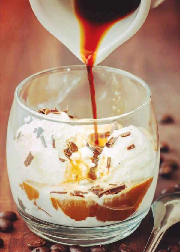 Affogato means ” to drown”, and that’s what this is-ice cream drowning in coffee. As the ice cream, it becomes creamy and thick.