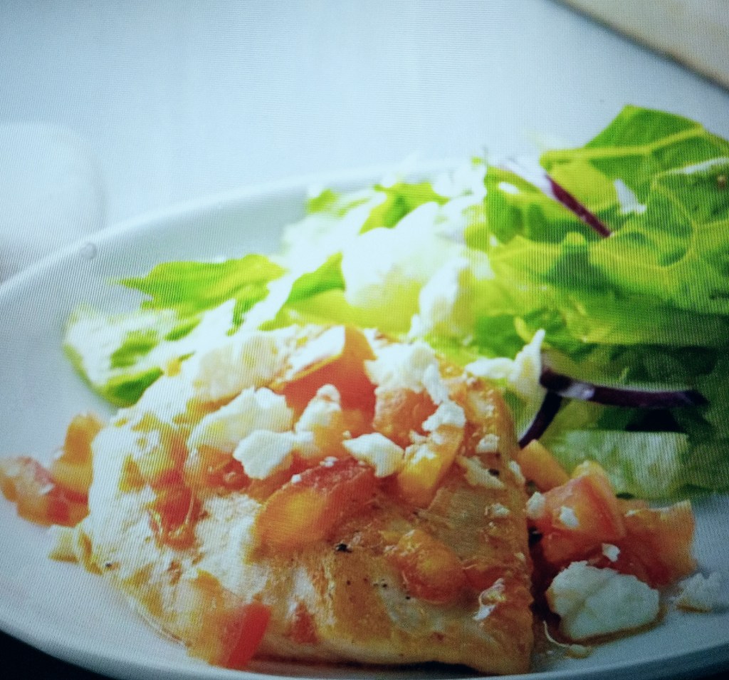 ~ Sprinkle children with salt,and pepper. In a large skillet, heat oil over medium-high heat. Brown chicken on each side. Turn chicken; add tomatoes on skillet and cook, covered, until tender, add salad dressing top with feta cheese.