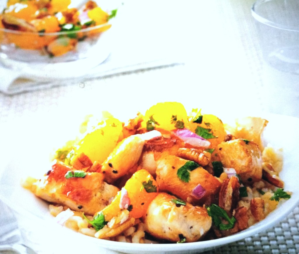 ~ Drain oranges, reserving 1/4 cup juice. For salsa, in a large bowl, combine oranges, pecans, onion and cilantro.
