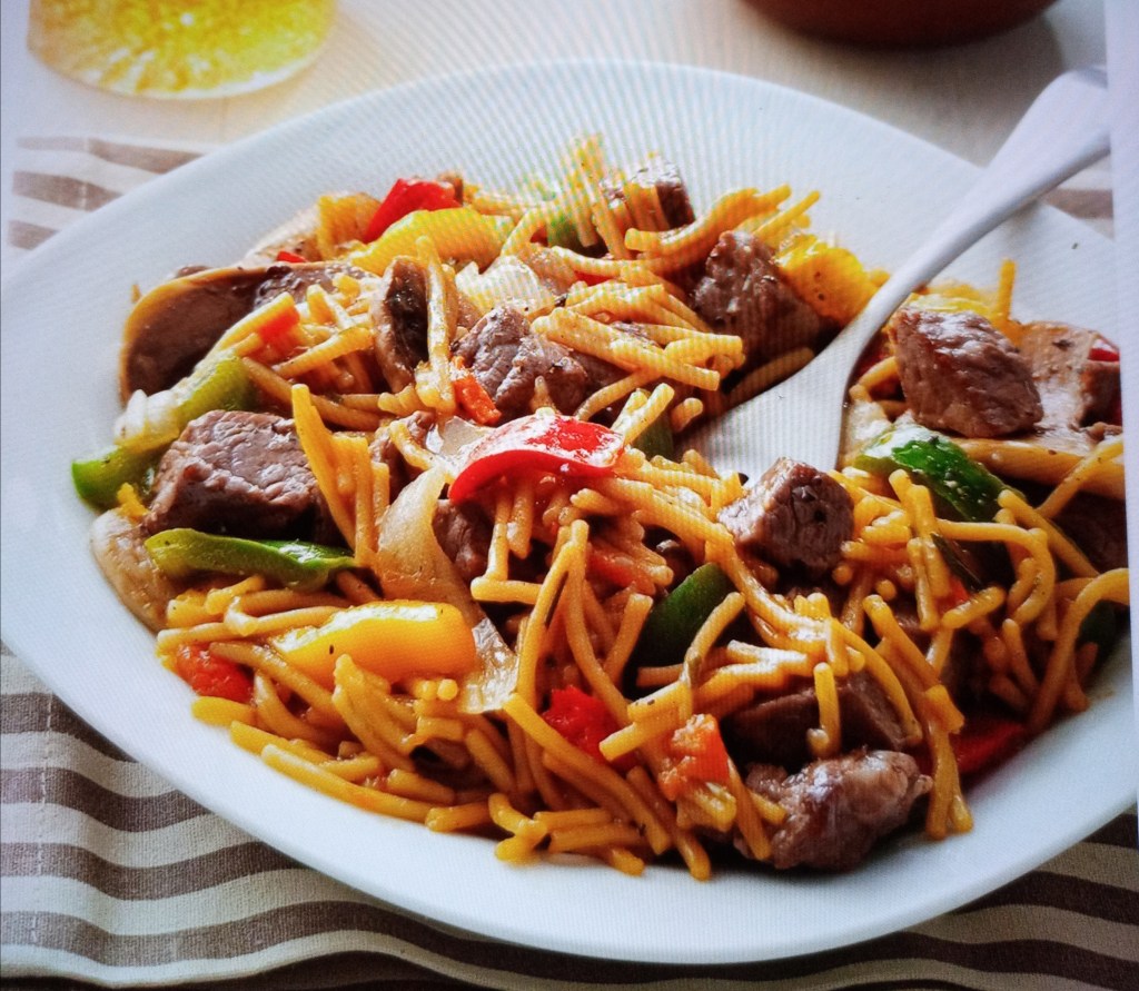 ~ Stir-fry vegetable and mushrooms in remaining oil 3-5 minutes. Return beef to pan. Stir in pasta and sauce mixture.