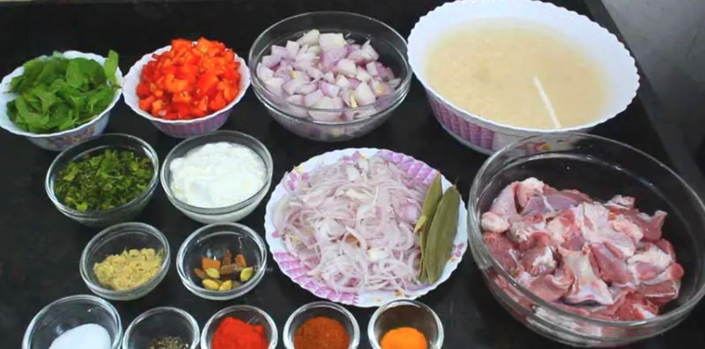 2. In a large bowl, mix the goat meat with the marinade ingredients – yogurt, ginger-garlic paste, red chili powder, turmeric powder, and garam masala. Marinate for at least 1 hour.