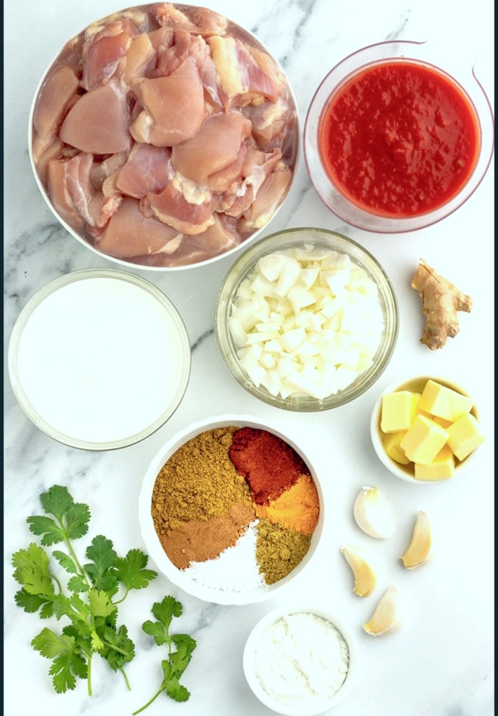 - In a large bowl, combine the yogurt, minced garlic, grated ginger, cumin, coriander, turmeric, paprika, garam masala, cayenne pepper, and salt. Add the chicken pieces to the bowl and coat them with the marinade. Cover and refrigerate for at least 1 hour, or overnight for best results.