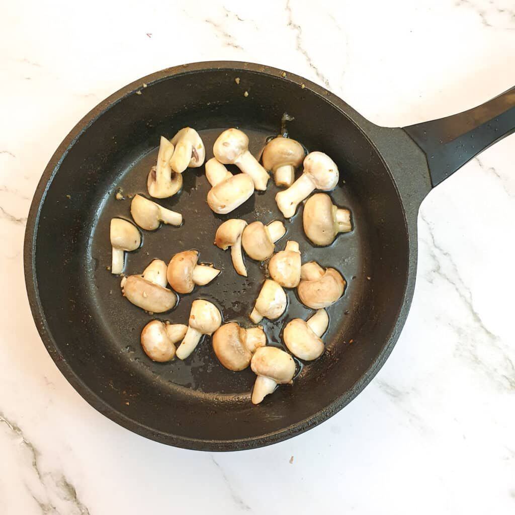 - Add the chestnut mushrooms (halved if large) and fry over high heat for a few minutes until golden. Remove and keep warm.
