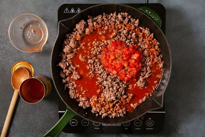 - In a skillet, brown and crumble the ground beef. Drain any excess grease.