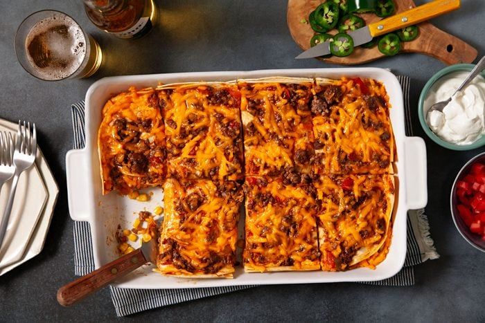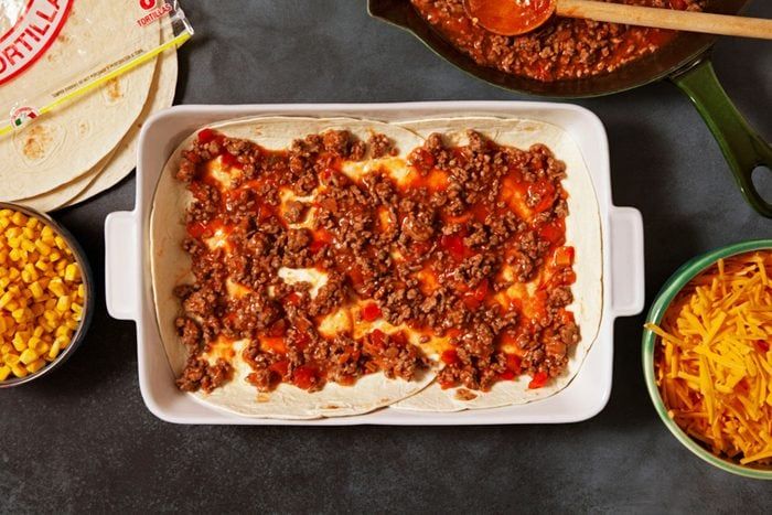 - Repeat the layers: enchilada sauce, tortillas, beef.