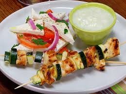 - Description: Greek skewers with grilled meat (chicken, pork, or lamb) served with pita bread and tzatziki.