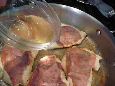 - Add white wine and chicken broth to the skillet; bring to a simmer.