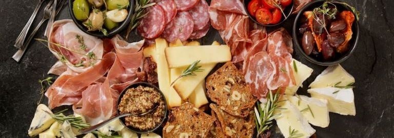 - Antipasti—often a charcuterie platter with a variety of vegetables (pepperoncini, mushrooms, and peppers being popular) and some cured meats, and/or sometimes bruschetta