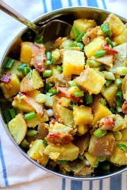 - Steps: Boil potatoes, mix with crispy bacon, herbs, and a mayo-mustard dressing .