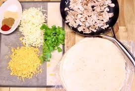 - Sprinkle cheese and chicken on half of the tortilla, then fold it over.