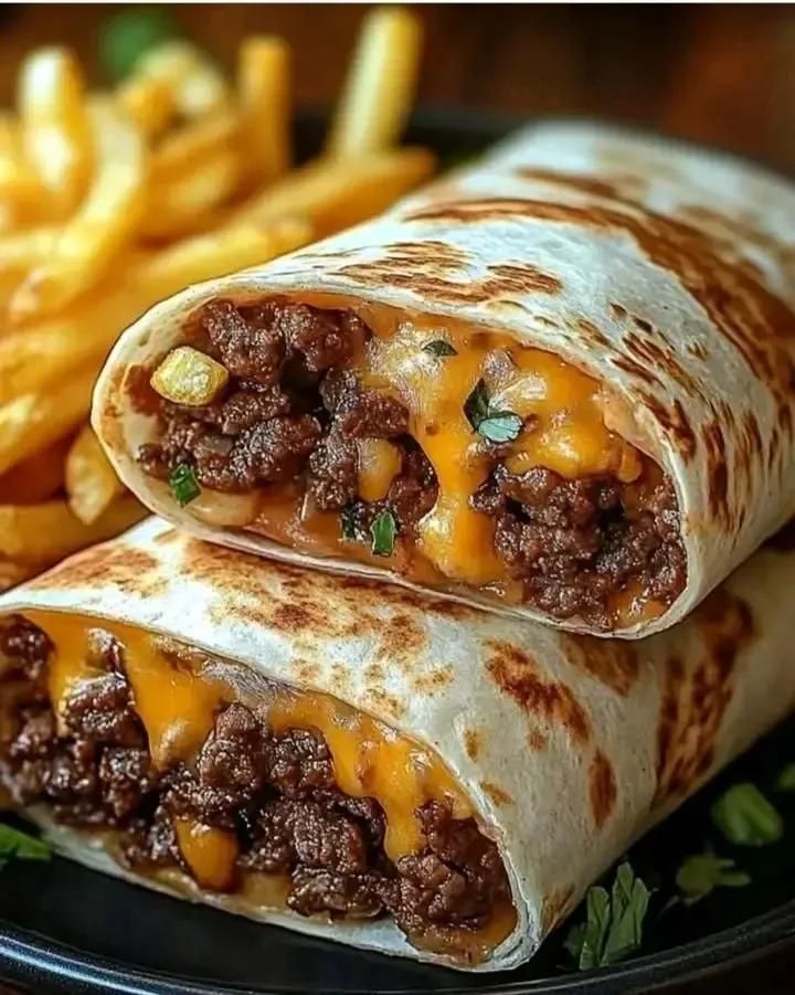 Here’s a delicious and detailed recipe for Cheesy Beef Burritos served with perfectly crispy fries.