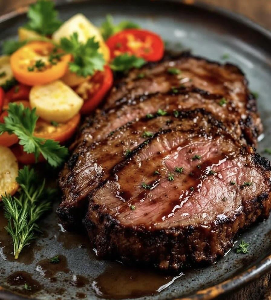 6. Plate: lay sliced steak beside the veggie medley, garnish with parsley & rosemary sprigs.