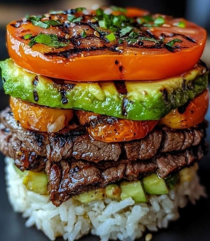 5. Assemble the stack: On a plate, layer rice at the base, add avocado, then steak, another avocado slice, grilled tomato, and finish with the top tomato slice.