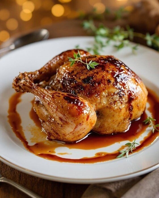 - Serve the chicken on a plate with the remaining brown sauce poured around it and garnish with fresh thyme.