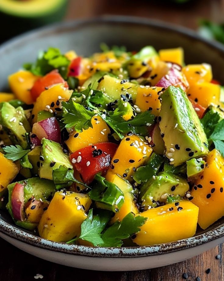 - Salad Composition: The salad is made up of diced mango, avocado, red onion, and cilantro.