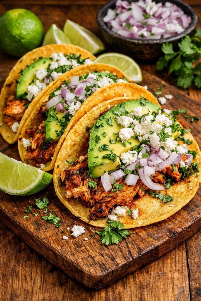 * – GRILLED CHICKEN TACOS (or meat, and are topped with sliced avocado, red onion, cilantro, and crumbled white cheese) .