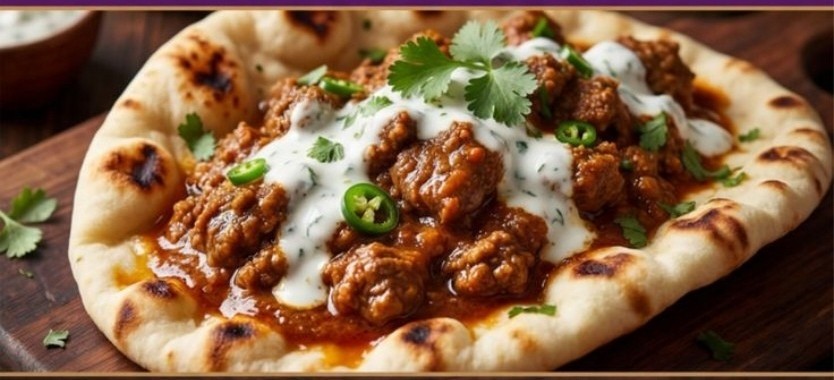 - Spoon the curried lamb onto the naan, drizzle yogurt, and sprinkle cilantro & sliced green chili.