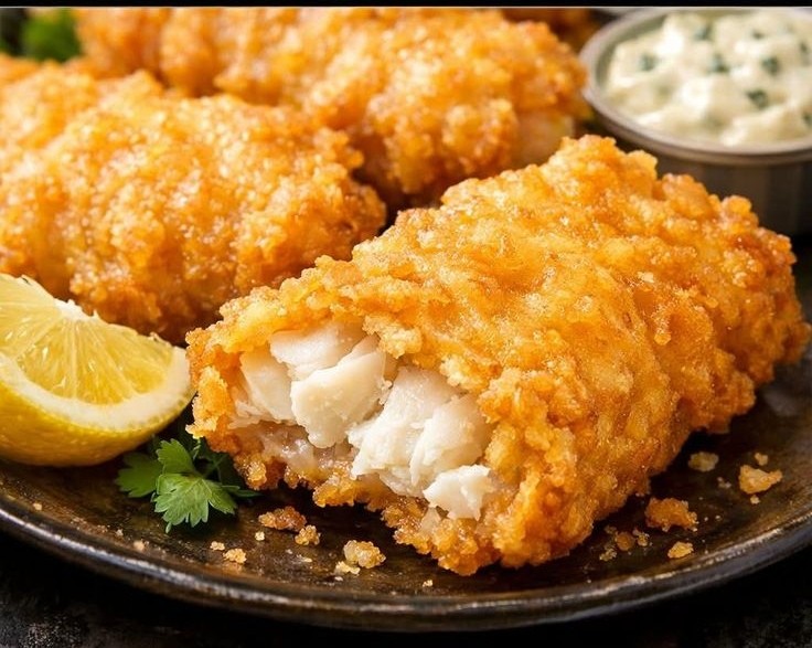 - Serve: Plate with lemon wedges, parsley, and the white dipping sauce shown (tartar or simple mayo‑lemon mix).