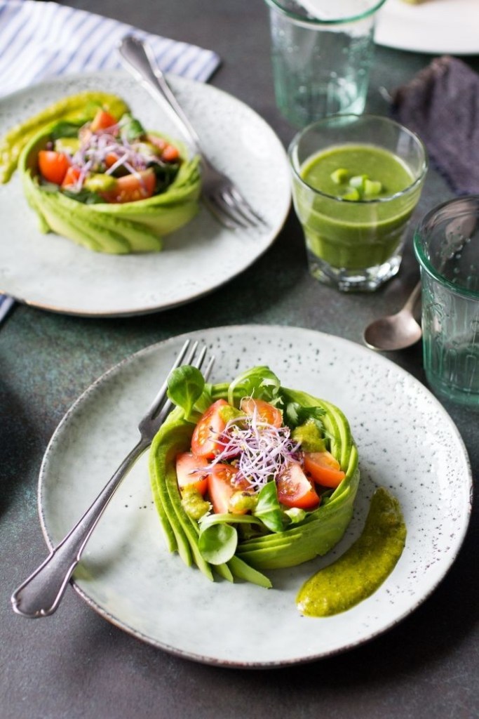 - Fill each avocado boat with the salad mix, top with microgreens.