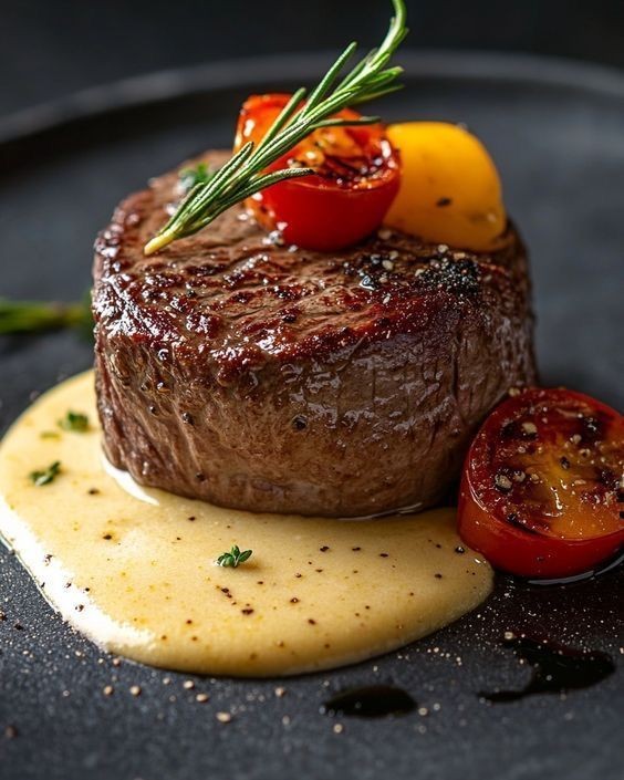* A CLASSIC BEEF FILET MIGNON WITH PEPPERCORN SAUCE & ROASTED TOMATOES: