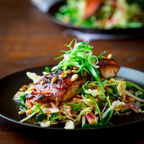 - Assemble: Place slaw on a plate, top with pork slices, sprinkle toasted pine nuts and green onion ribbons. Drizzle any remaining glaze over the top.