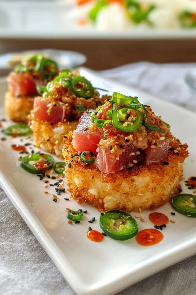 - Assemble: Place tuna poke on each rice cake. Top with jalapeño slices and remaining sesame seeds. Drizzle with sriracha or spicy mayo if desired.